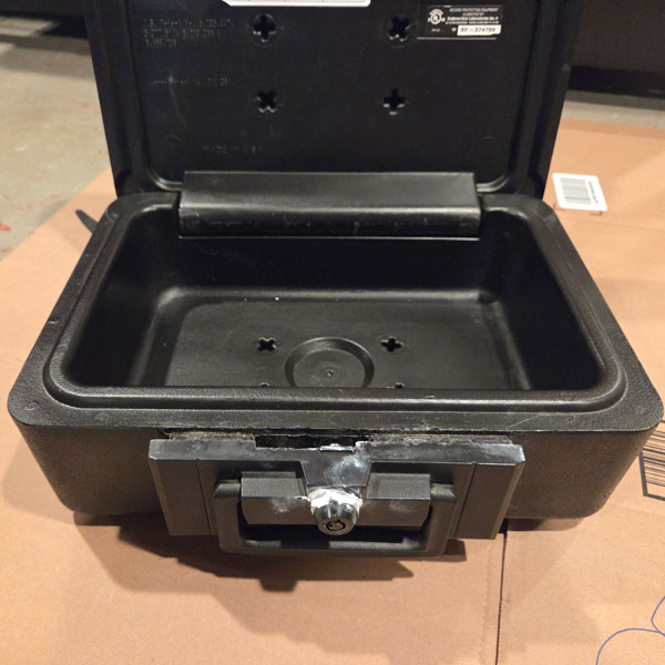 When looking into a small fire resistant Sentry Safe where the correct keys would not operate anymore, I found the locking mechanism to be extremely jammed and it was easily opened without the key. This small project entailed removing the lock panel without causing damage, and then replacing the lock with another that would operate the same way as before but with higher security. Some hot glue was used to keep the fire resistant material in place after removing the lock/handle panel. From the factory, the panel is snap fit to the safe body with some minor glue around the edges and the panel has four prongs that stick into the fire resistant material. I utilized a vice and hammer to remove the original lock plate for installation on the new 1-1/8" tubular cabinet lock. The new lock was then epoxied with putty to keep it from turning in the original lock housing.